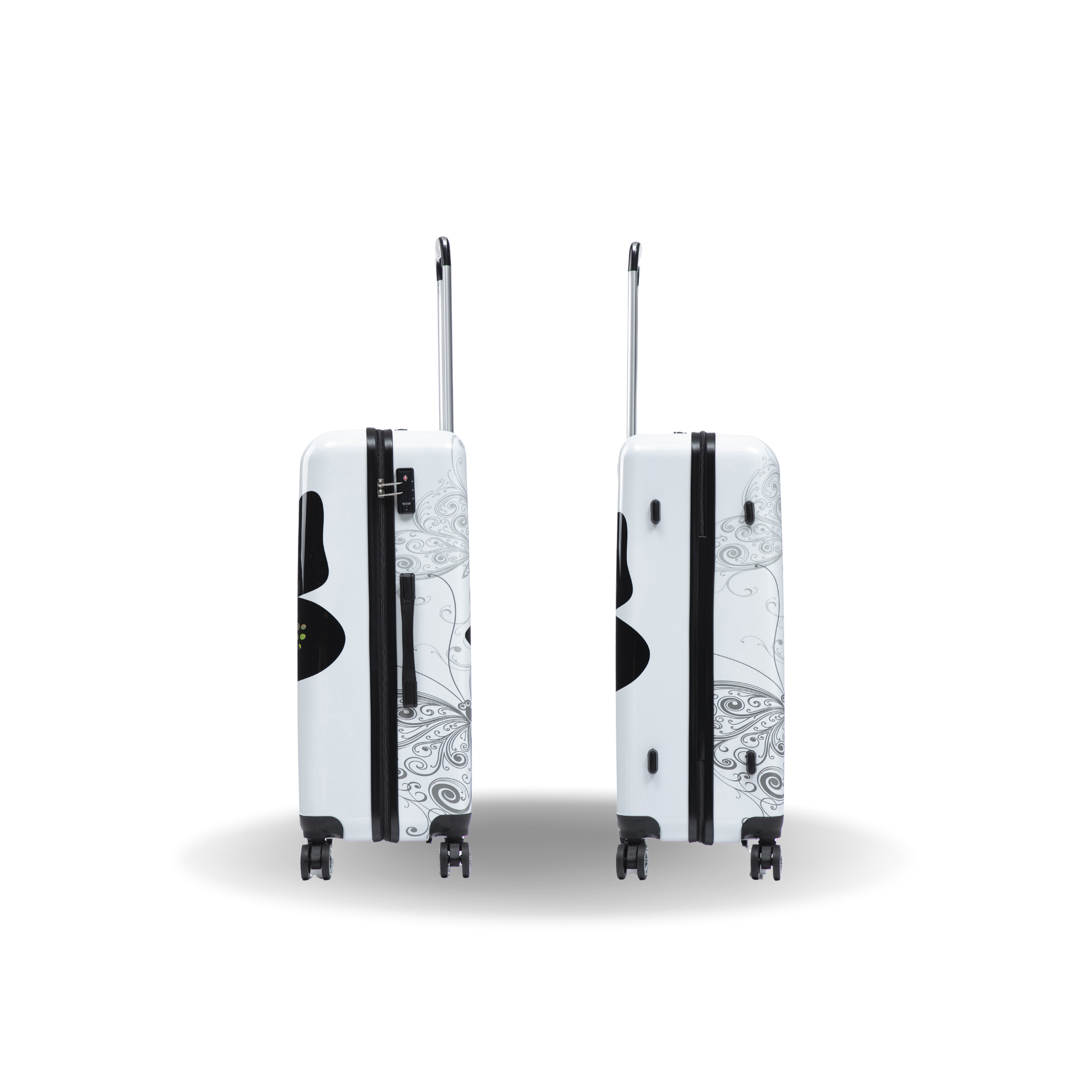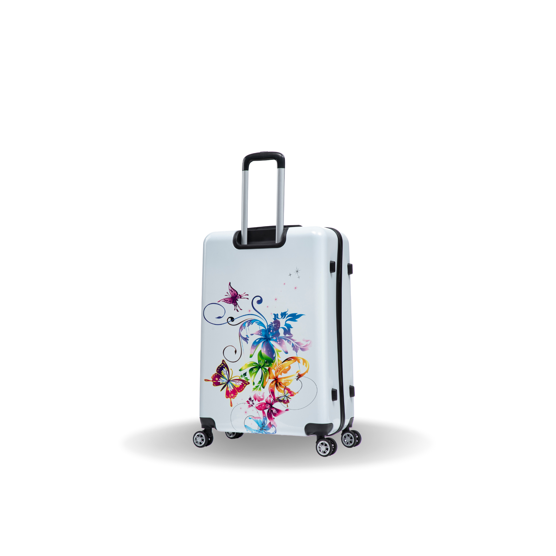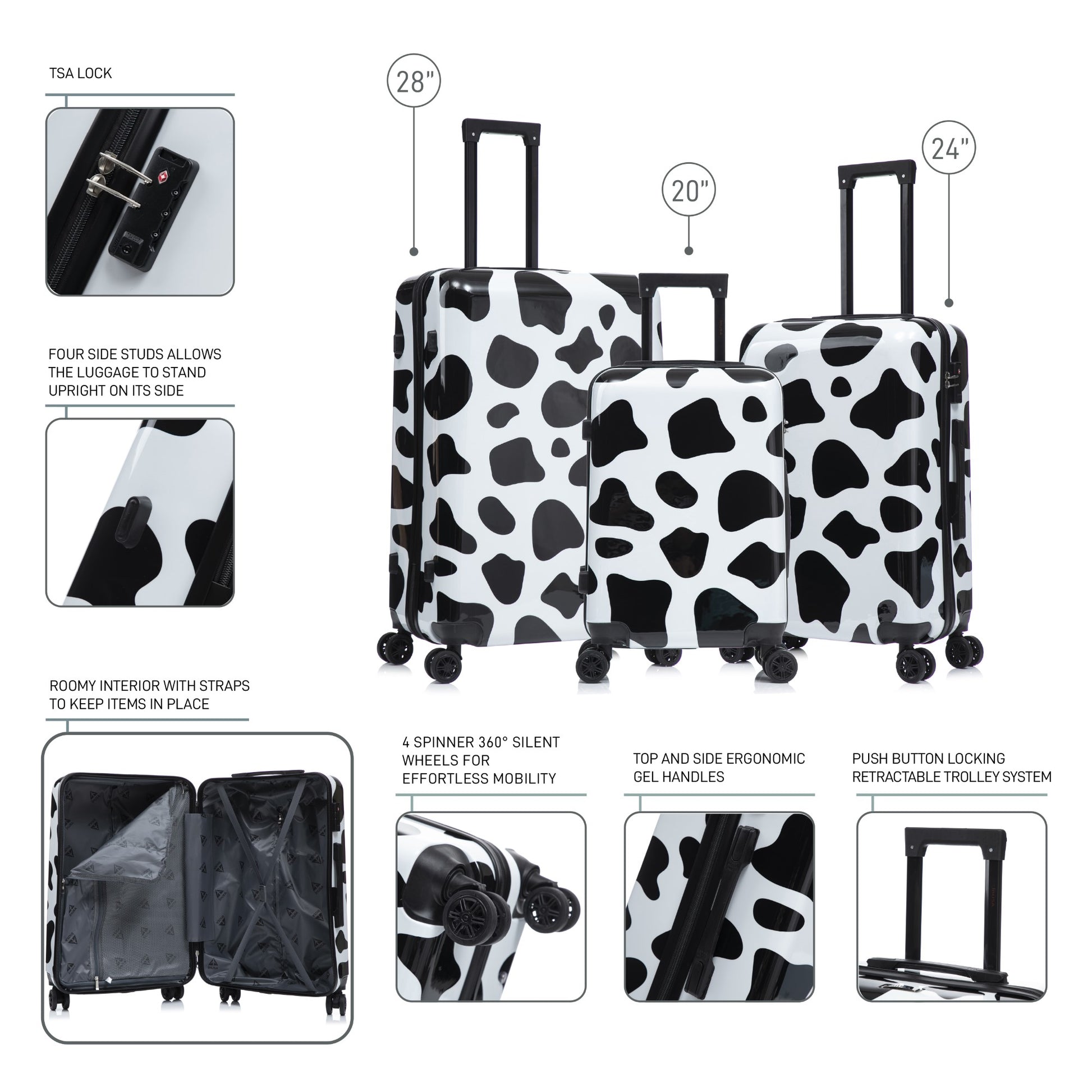 • Four spinner multi-directional silent 360° wheels for effortless mobility.
